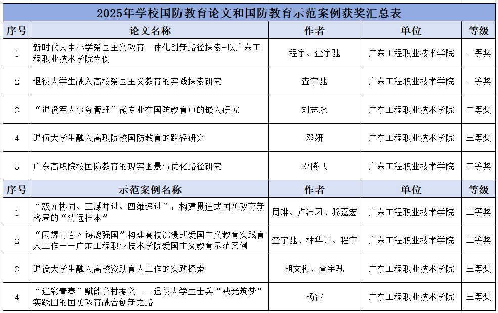 近日,广东省教育厅发布《关于2025年全省学校优秀教学成果奖(职业教育)拟获奖名单的公示》,我校共有4项教学成果入选,其中特等奖1项、一等奖2项、二等奖1…