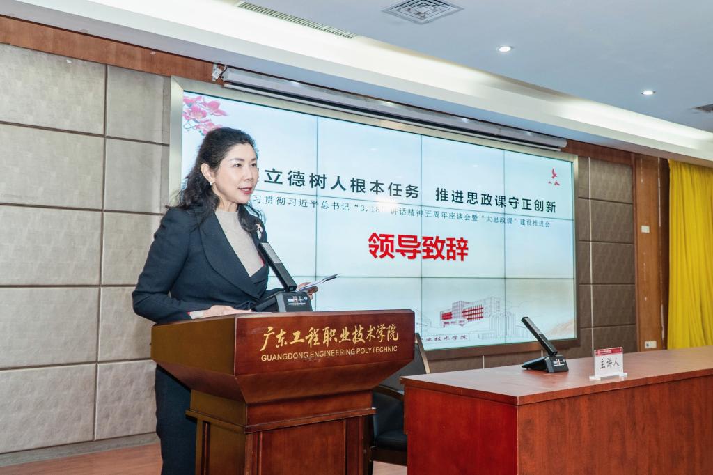 校党委副书记、校长李丽教授在会上致辞。李校长强调,五年来我校思政课建设及立德树人各方面工作取得可喜成绩和宝贵经验,学校将继续深入贯彻习近平总书记“3.18”重要讲话精神,强化理论武装,守正创新,锐意进取,全力保障和推动马克思主义学院建设和思政课高质量发展,善用“大思政课”培育能工巧匠、大国工匠。