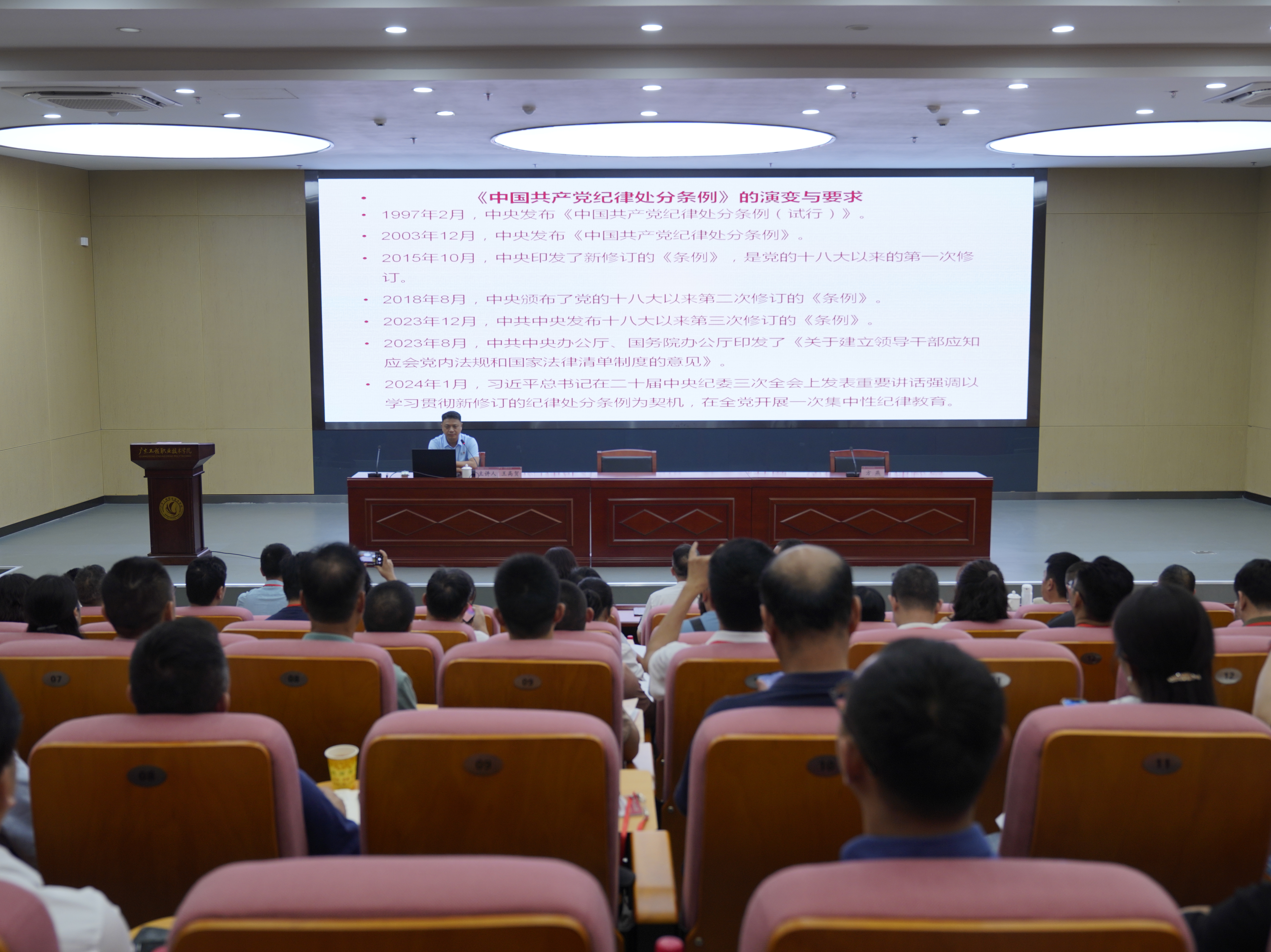 王高贺教授以“新修订《中国共产党纪律处分条例》解读”为主题,从《中国共产党纪律处分条例》修订背景与意义、修订过程和特点、新旧版本条例对比分析等方面进行了系统解读和深入阐释。他结合“六大纪律”的主旨要义和规定要求,重点围绕与党员干部师生密切相关的纪律规定,对《条例》新增或修改部分的主要内容、关键条款进行了详实解读,引导全校党员干部搞清楚党的纪律规矩是什么,弄明白能干什么、不能干什么,进一步强化纪律意识、提高党性修养。整场主题鲜明、逻辑严谨、内容丰富、案例详实,既有理论高度,又有很强的实践指导性,为进一步扎实开展党纪学习教育起到了很好的推动作用。