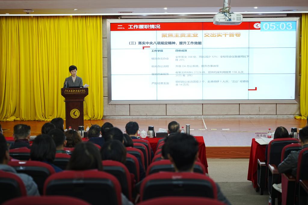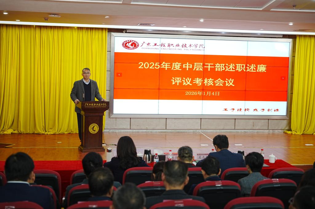 1月4日,学校在广州校区图书馆报告厅召开2025年度学校中层干部述职述廉评议考核会议。全体学校领导、中层干部参加会议。党委副书记陈冬梅主持会议。