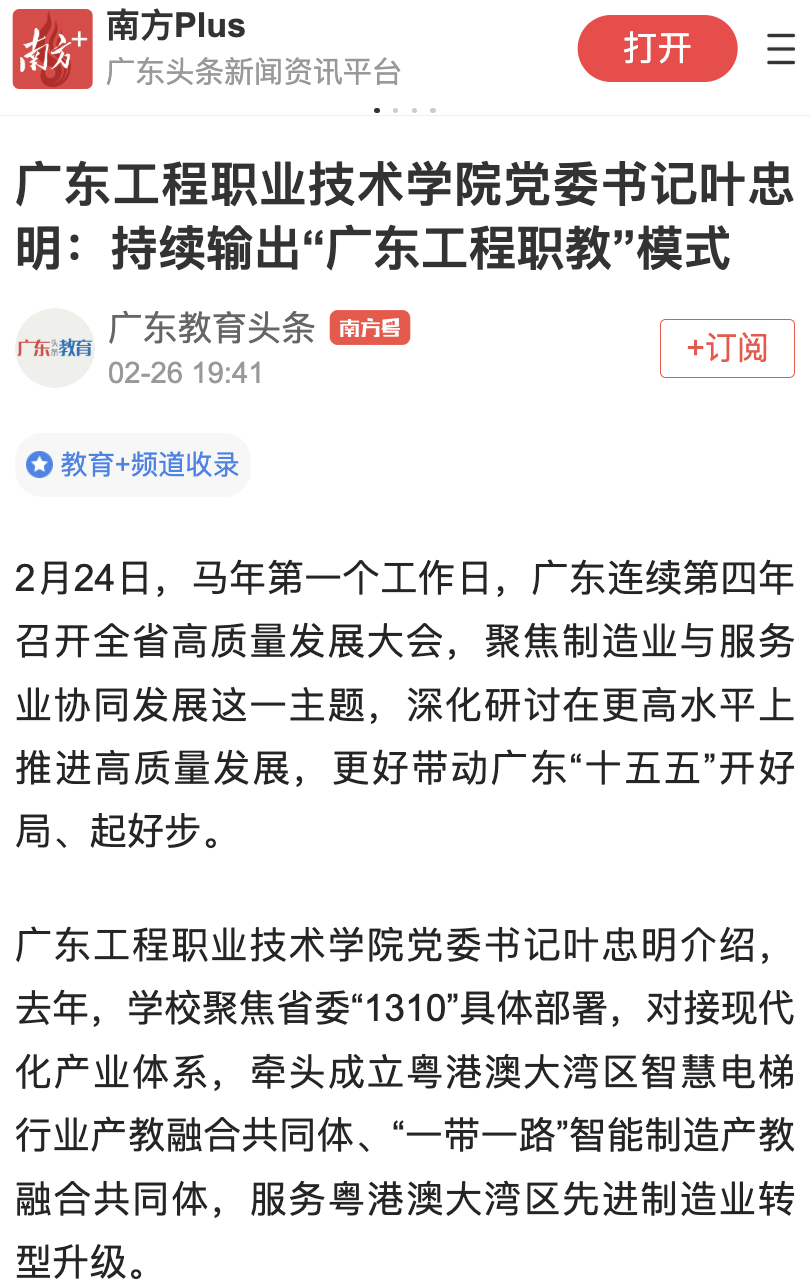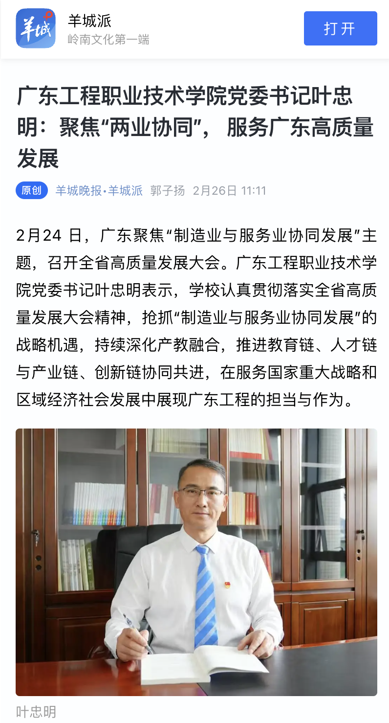 以下是《南方Plus》“广东教育头条”刊发专访报道《广东工程职业技术学院党委书记叶忠明:持续输出“广东工程职教”模式》。
