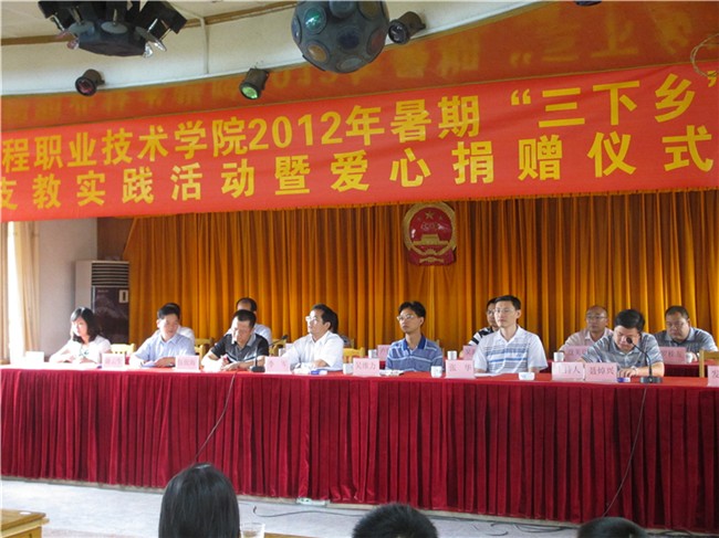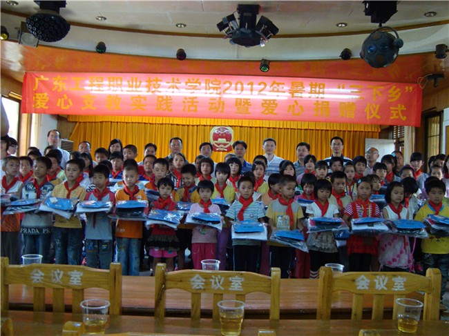 2012年7月11日上午,广东工程职业技术学院2012年暑期"三下乡"爱心支教实践活动暨爱心捐赠仪式在云安县南盛镇政府2楼会议室举行。出席仪式的有:学院党委李军副书记、云安县委吴维力副书记、云安县委组织部部长伍俊海、学院学生工作部部长张华、学院团委书记黄馥丽、财经系党总支副书记吴海彬、团云安县委书记聂焯兴、南盛镇镇委书记谢云生,出席仪式的还有南盛镇中心小学校长、横岗小学校长、我院36名参加支教的老师、学生,南盛镇60名留守儿童等。