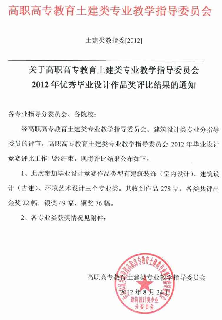日前,由高职高专教育土建类专业教学指导委员会建筑设计类专业分指导委员会主办的"第七届全国高职高专教育建筑设计类专业优秀毕业设计大赛" 在南宁职业技术学院举行,我院选送的2009建筑设计技术A班学生张瑞源的毕业设计作品:河源市佰科盛业电子科技公司厂房区设计方案,在大赛中荣获金奖。