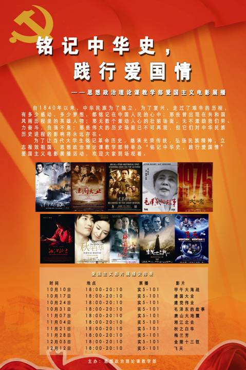 为了让大学生铭记历史,继承光荣传统,弘扬民族精神,立志报效祖国,思想政治理论课教学部从本学期开始举办了"铭记中华史,践行爱国情"爱国主义电影展播活动。