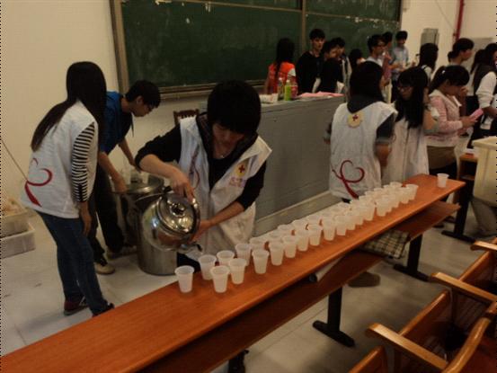 11月1日,校本部实训5号楼大厅,院团委和红十字会在这里组织了大型无偿献血活动,下午1点,献血车还未到校园,大厅里就已经聚集了大量的人群,院红十字会的干部和会员们早早地布置好场地并且井然有序地进入到自己的工作岗位,等待献血的师生们已经按照红十字会工作人员的引导在现场排起了长龙,1点半献血车一到校园,紧张而忙碌的献血工作就开始了。填表、验血、献血、救护、发放献血证有条不紊地立即展开了;现场气氛紧张、热烈、井然有序而且鼓舞人心,一袋袋鲜红的血液从献血者的体内流淌了出来,献血者中有老师,更有大量的同学们。血液是有感染力的,许多原本不准备献血的师生和现场的红十字会工作人员纷纷挽起衣袖,加入到献血者的行列,直到献血结束仍然有许多学生要求献血,无奈天色已晚,考虑到饥饿状态下不利于献血,只好奉劝大家下次再献,献血活动直到7点钟才结束,当天有363人捐出了鲜红的血液。