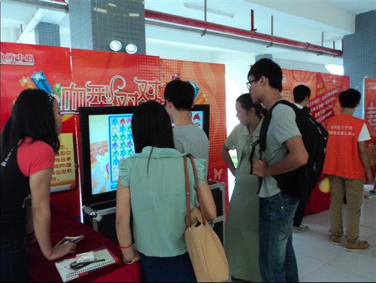 10月18日,在西校区和凤凰学生公寓,同时进行无偿献血宣传游戏和献血车进校园活动。12点一下课,院红十字会的干部和会员们顾不上吃饭就奔赴两个校区开始了紧张而忙碌的工作,他们配合广州血液中心的工作人员布置场地,现场竖起了大幅的献血宣传海报和一排血液和献血知识的展板,旁边配备了寓教于乐的游戏,有连连看触摸屏、套圈、飞镖等游戏项目,游戏现场吸引了大量的学生参与,同学们在愉快的游戏中不仅快乐无比,欢声笑语不断,同时也了解了血液和献血方面的知识,更有部分同学玩完游戏就上了献血车,奉献了自己的一片爱心,当天就有150多人无私地捐出了自己鲜红的血液。