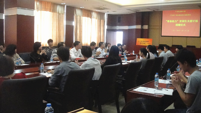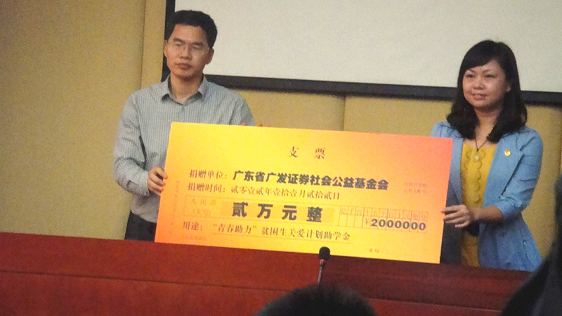 2012年11月22日,由广东省直团工委和广东省广发证券社会公益基金会共同发起的2012年广东省直院校"青春助力"贫困生关爱计划的捐赠仪式隆重举行。广东省直团工委书记李田,广发证券监事长、广发证券社会公益基金会理事吴钊明等领导出席,学院团委黄馥丽书记和受助学生代表参加了大会。