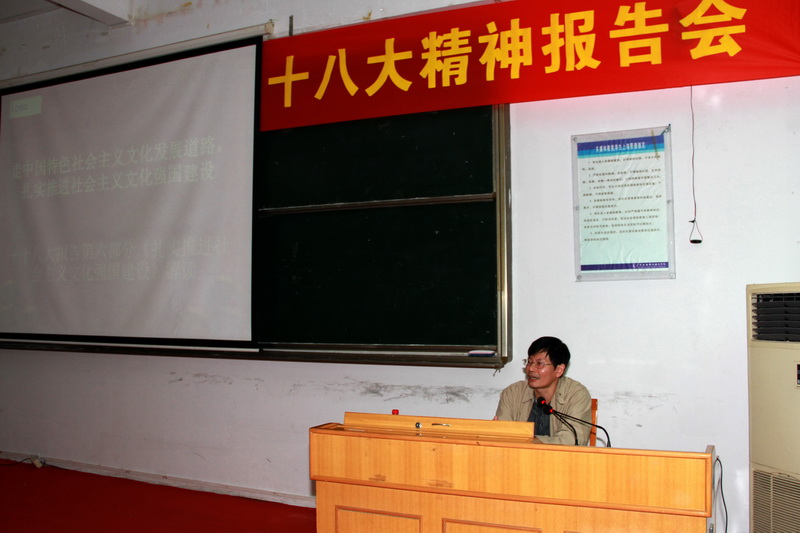 为学习宣传贯彻党的十八大精神,贯彻落实省科协党组书记、常务副主席梁明同志以及党的十八大代表、省委教育工委书记、省教育厅厅长罗伟其同志提出的迅速在高校掀起学习贯彻落实党的十八大精神热潮的部署要求,我院特邀广东省委党校著名学者陈创生教授为全体党员及中层以上干部作了题为《走中国特色社会主义文化发展道路扎实推进社会主义文化建设》的专题报告。