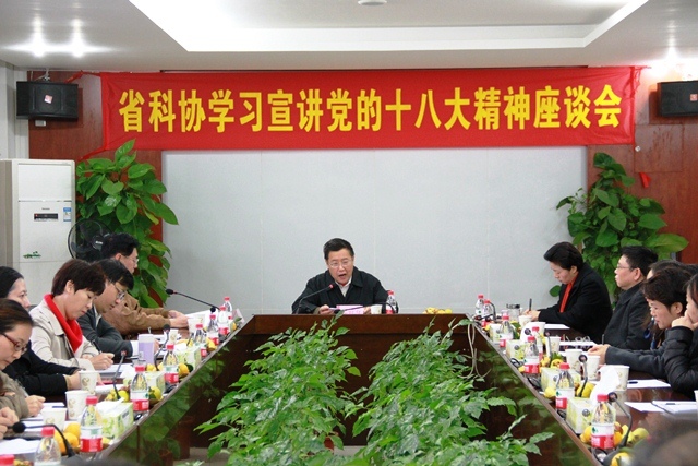 省科协专职副主席汤世华在会议传达了省直机关工委关于在党外人士中开展学习宣讲党的十八大精神的工作部署。他指出,学习宣传贯彻党的十八大精神要全面认识、准确领会、深刻理解,要坚持理想信念,追求崇高,打牢思想根基。他同时提出了坚持科学发展观、高举中国特色社会主义伟大旗帜、走中国特色社会主义道路、学以致用等八点要求。