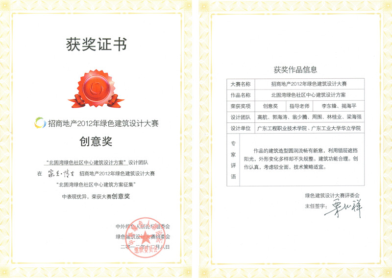 近日,由住房和城乡建设部科学技术委员会、国家发展和改革委员会国际合作中心、联合国环境规划署可持续建筑促进会(UNEP-SBCI)联合主办,招商局地产控股股份有限公司承办的"第九届中外绿色人居论坛"暨"2012年全国绿色建筑设计大赛颁奖典礼"于江苏常州举行,我校建筑工程学院李东锋老师应邀参加大会。由李东锋老师指导,建筑设计技术专业大三学生梁海强及华立学院周围、高航等同学共同完成的参赛作品---《北固湾绿色社区中心方案设计》荣获大赛"创意奖"。我院是本次大赛晋级决赛的唯一高职院校!
