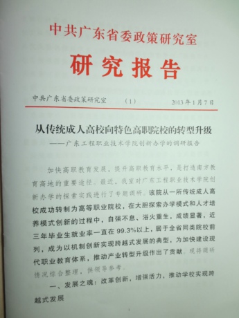 2013年1月7日,中共广东省委政策研究室2013年1号文以《从传统成人高校向特色高职院校的转型升级—广东工程职业技术学院创新办学的调研报告》(以下简称:调研报告)为题对我院近年来在省委省政府正确领导下,在省科协、省教育厅的关心指导下取得跨越式发展进行了专题报道。《调研报告》报送省委常委、副省长、省人大常委会主任、副主任、省政协主席、副主席、中央政研室综合局、省委办公厅、省人大常委会办公厅、省政府办公厅、省政协办公厅、省委组织部、省委宣传部、省发展改革委、省经济和信息化委、省教育厅、省科协等多个部门,引起良好反响。《调研报告》充分反映了我院依托珠三角的建设与发展积极开展产学研合作,依托社会资源办学,在人才培养模式、办学模式等众多方面创出特色品牌,取得了良好的社会效益和经济效益,获得了企业与社会的信任,赢得了政府的支持。省委政研室的调研报告为学院的建设发展及争创省级示范性高职院校和国家就业示范院校营造了良好的舆论氛围。