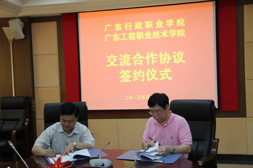 最后,我院劳汉生院长与韦华腾书记代表两校共同签订了《交流合作协议》。根据《协议》,我院将在今后3年内,在教育教学管理、专业及课程建设、师资队伍建设以及行政管理等方面对广东行政职业学院开展交流与合作,以推动两校相互促进,共同提高。