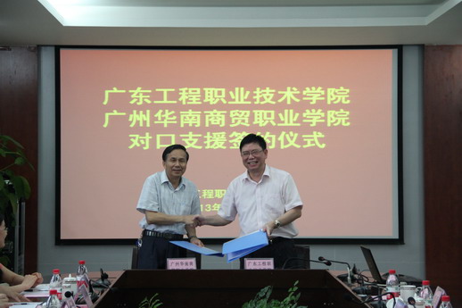 最后,我院劳汉生院长与张德扬院长代表两校共同签订了《广东工程职业技术学院对口支援广州华南商贸职业技术学院合作协议书》。根据《协议》,我院将在今后3年内,在教育教学管理、专业及课程建设、师资队伍建设以及行政管理等方面实施对广州华南商贸职业技术学院的支援与合作,以推动两校相互促进,共同提高。
