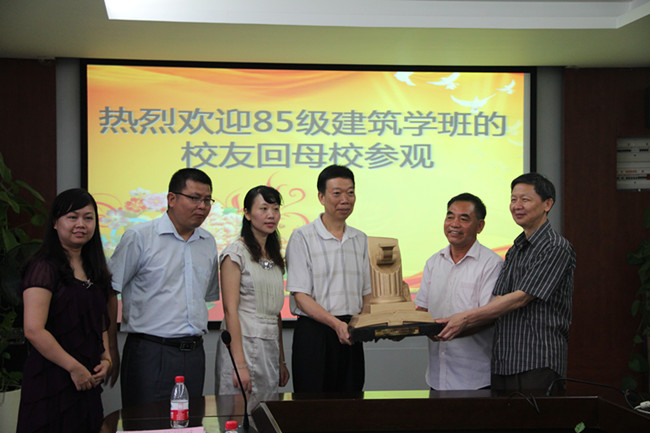 随后老班长原广州黄浦区环保局局长张军代表校友发言,他表示离开母校20多年,如今他们在广东建筑和其它行业领域都有所成就,这要感谢母校曾经对他们的培养。老校友们为学校的发展壮大感到高兴和自豪。校领导们还表达了对校友们的衷心祝福,希望校友们能"常回家看看",关心学校的发展,为学校出谋划策。最后,八九届校友向学校赠送了他们亲自设计制作的纪念品并合影留念。