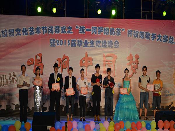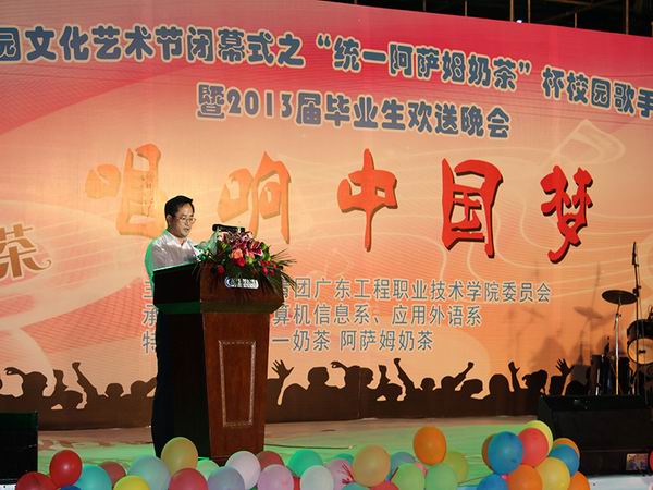 由学院团委主办,计算机信息系、应用外语系承办的广东工程职业技术学院第十五届校园文化艺术节闭幕式之"统一阿萨姆奶茶"杯校园歌手大赛总决赛暨2013届毕业生欢送晚会于28号晚在学院行政楼前广场华丽上演。出席本次晚会的有学院党委副书记李军博士、副院级领导陈杰伦副教授,各院(系)书记(副书记)以及广州统一企业有限公司杨孟杰经理、马晓玲经理等学院师生代表。学工部桂爱民副部长、团委黄馥丽书记、人文社科系焦英副主任、实训中心郑皓丹老师和人文社科系温洁芸老师担任了本次校园歌手大赛决赛的评委。院团委施焦副书记主持了本次活动的颁奖晚会。