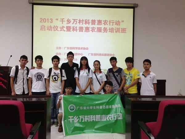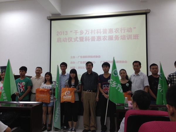 7月10日,由广东省科学技术协会主办,广东省科普中心、广东省科普志愿者协会承办的2013"千乡万村科普惠农行动"启动仪式暨科普惠农服务培训班在华南师范大学五山校区举行。中国工程院院士、广东省科普志愿者协会会长刘人怀,广东省科学技术协会副主席吴焕泉,广东省科学技术协会科普部黄善辉部长,广东省财政厅教科文处副处长饶伟强等出席了本次仪式。仪式由广东省科普中心郑文丰主任主持。我院志愿者代表参加了此次活动。
