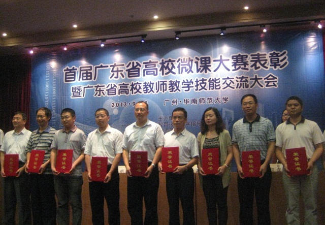 广东省首届高校微课大赛于2013年8月落下帷幕。我校选手在高职高专组激烈竞争中,脱颖而出,共有三位老师荣获一、二等奖。其中,思想政治教学理论部曾名沁老师获一等奖,电梯学院肖青老师、思想政治教学理论部张建德老师分别获得二等奖。由于我校在大赛组织活动中表现出色,成绩突出,被大赛组委会授予"优秀组织奖"(共10个单位,7所本科院校,3所高职院校)。