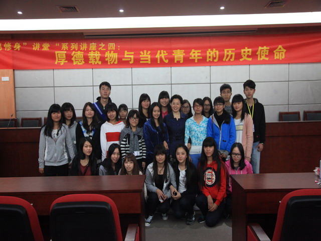 "天行健,君子以自强不息;地势坤,君子以厚德载物",刘文清书记从"厚德载物"博大精深的内涵切入本次讲座的主题,主要从道德底线遭受怀疑的时代、厚德载物与当代青年的历史使命、立德为本的具体实践三个方面来展开讲述。刘书记先通过"中国好人"陈起贤等诸多道德楷模与社会中存在的一些丑恶现象的对比,号召广大青年见贤思齐,谨守道德底线;然后,结合全球化、信息化不断推进的世界潮流与我国繁荣稳定的大好形势以及学院迎难而上跨越式发展的事实,刘书记也联系自己积极进取、为理想不断追求的亲身经历来告诉广大青年学子应珍惜今天的美好生活,敢于接受挑战,树立远大理想、练就过硬本领,争做有为的优秀青年。教育同学们在今后的学习、生活中坚持"立德为本",从"口德"、"面德"、"信德"、"谦德"、"礼德"、"敬德"、"仁德"七个方面培养良好的道德品格,坚信"有德"才"有得",要做到志存高远,敬德修业,勇于承担时代所赋予的光荣使命,通过为中华民族伟大复兴贡献力量来成就自己的辉煌人生。
