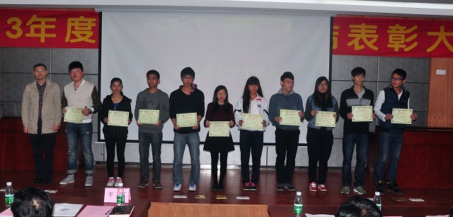 会上,学生工作部副部长桂爱民作2013年学生工作总结,重点从学生日常思想教育、学风建设、校园文化建设等几个方面总结了本年度的工作开展情况及取得的成绩。团委书记黄馥丽对大会宣读了表彰决定。