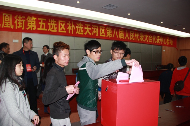 2014年1月15日,凤凰街第五选区补选天河区第八届人民代表选举大会在学院图书馆报告厅中心会场举行。首先,选区选举工作领导小组成员王胜利同志宣读了选举工作主持人委任书。随后,学院纪检监察室主任周其舟同志宣读了选举办法。选举工作主持人向广大教职工和学生选民介绍了选举工作准备情况和投票注意事项,宣读了监票人、计票人建议名单,并现场确定。监票人现场检查了票箱,监票人、计票人首先进行了投票。刘文清等学院领导郑重投下了自己庄严的一票。随后,学院各部门、各院系的选民依次有序开始投票。