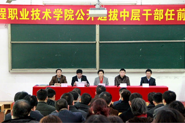 党委副书记、院长劳汉生在会上对本次公开选拔中层干部情况作了说明。他指出,本次公开选拔中层干部为学院示范建设和转型升级提供组织保障,中层干部是学院发展的中坚力量,承担示范建设和转型升级的重任。本次公开选拔中层干部严格按照有关文件规定进行,体现了德才兼备、以德为先的原则,体现了公开、公平、公正的原则,体现了以人为本的精神。劳汉生明确要求新任的中层干部回答和处理好"六个问题"。一是要回答好做事还是做官的问题。中层干部要做一个"五事"干部:敢干事、想干事、能干事、干成事、不出事。二是要回答好为公还是为私的问题。要管理为公,无私无畏,去除私心。三是要回答好履职还是忽悠的问题。新任干部要踏踏实实工作,自主工作,独立工作,强化执行力,不敷衍,不忽悠。四是回答好担当还是推脱的问题。要敢于担当,勇于担当,多提方案建议,为领导出谋划策。五是要回答好服务的问题。要改变门难进、事难办的作风,增强服务意识。六是处理好计划还是应急问题。学会制定目标任务。最后他要求所有中层干部要"顾大局、懂管理、讲团结、正风气、守纪律、负责任"。