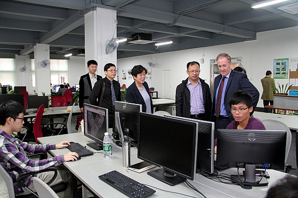 Tony Gray还在办公室、招生就业办人员的陪同下参观了校史馆、就业文化广场、创业文化广场、职业指导中心、电梯工程学院、建筑工程学院BIM中心。