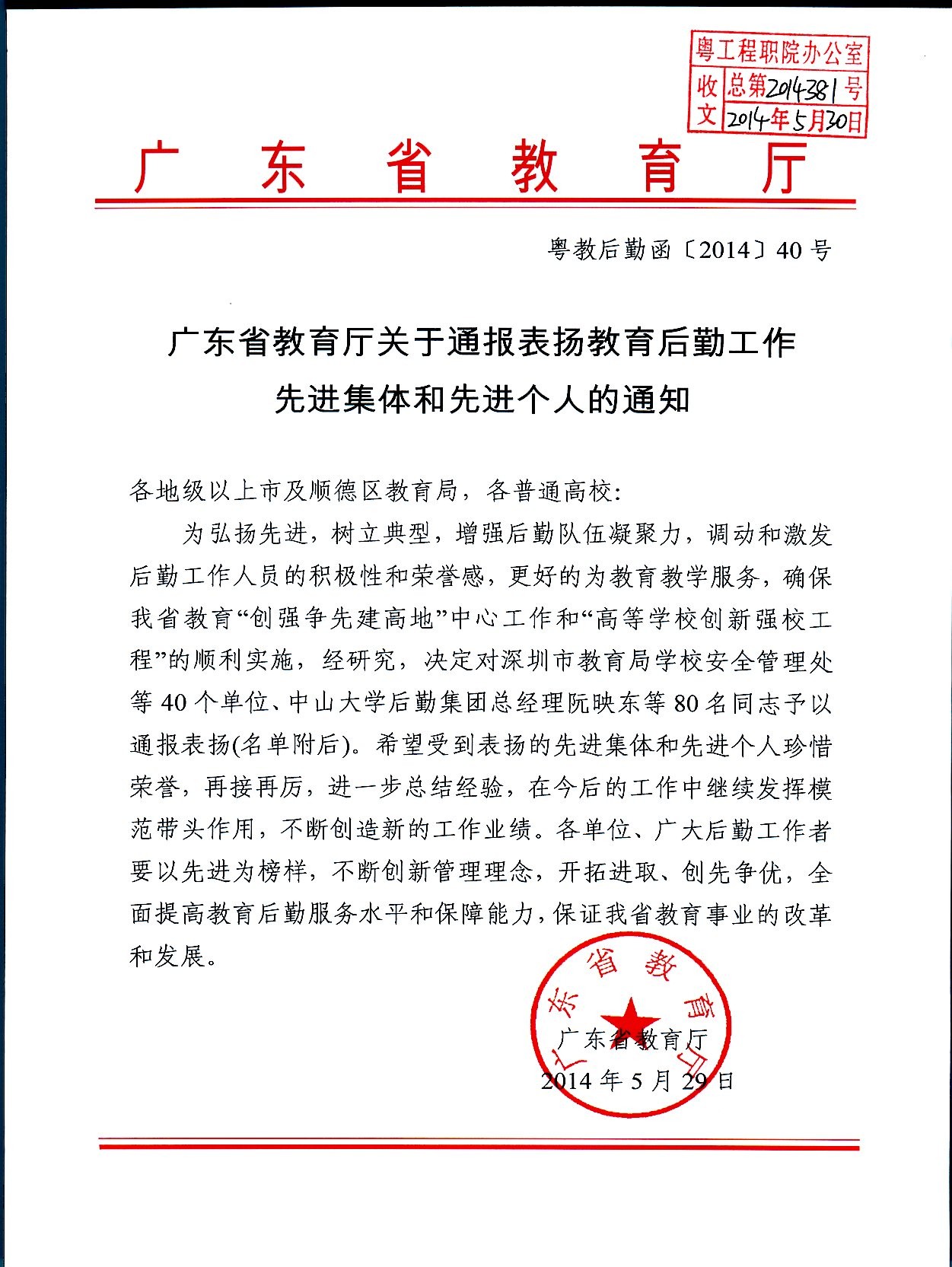 5月29日,我校后勤集团荣获广东省教育厅评定"广东省教育后勤工作先进集体"称号。此次评选由广东省教育厅主办,目的是为了弘扬先进,树立典型,增强后勤队伍凝聚力,确保我省教育"创强争先建高地"战略任务和我省高校"创新强校"工程的顺利实施。