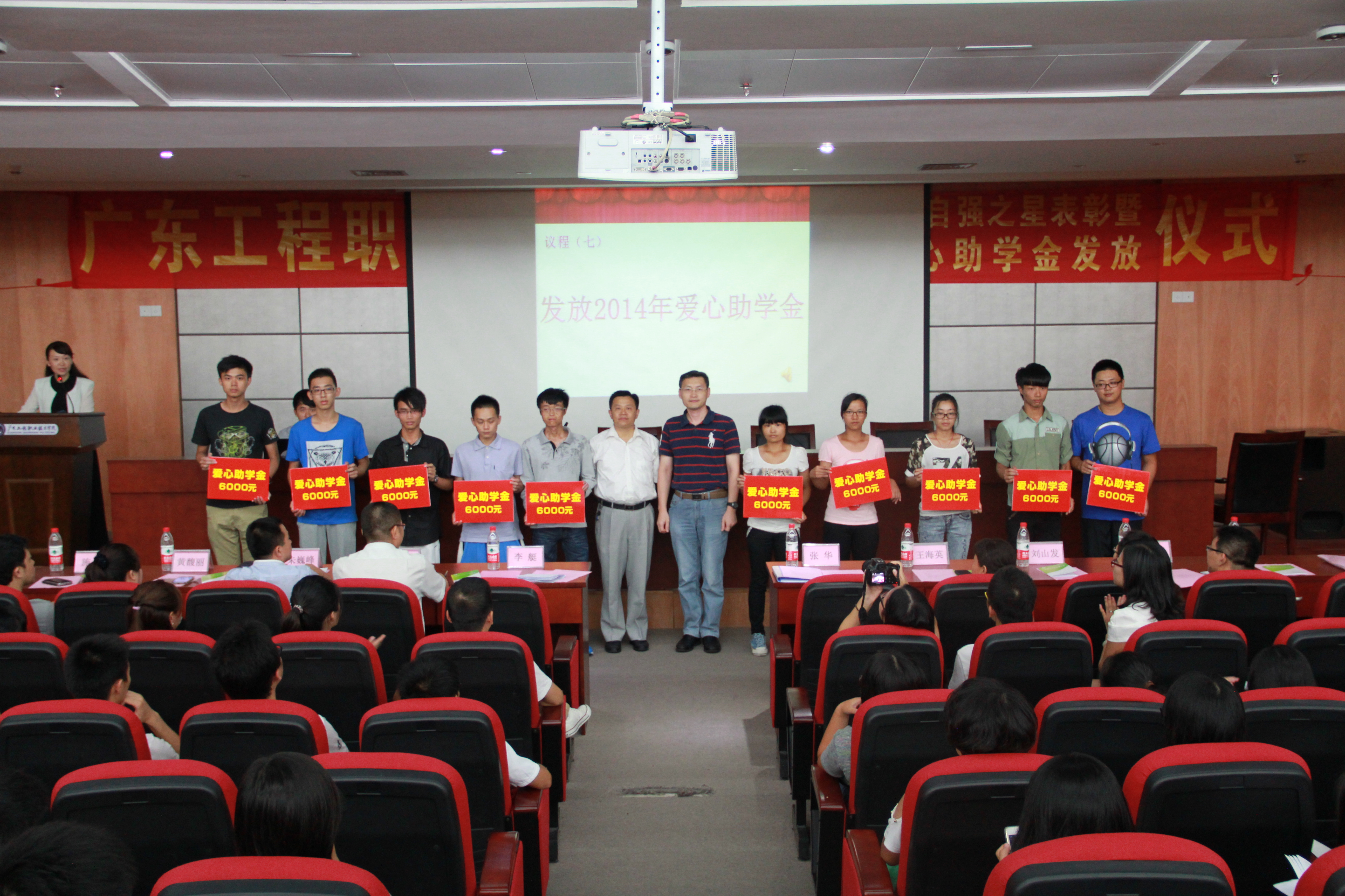 9月29日,我校举办了首届校院十大自强之星表彰大会暨2014年爱心助学金发放仪式。出席本次大会的领导有学校副校长李艇、外语经贸学院院长邢植朝、图书馆馆长王海英、生产实训中心主任陈国雄、现代教育技术中心主任朱巍峰、学生工作部部长张华以及学生工作部全体老师、各二级学院的党总支副书记,各二级学院辅导员、2014级学生代表参加了本次大会,大会由学生工作部副部长桂爱民主持。