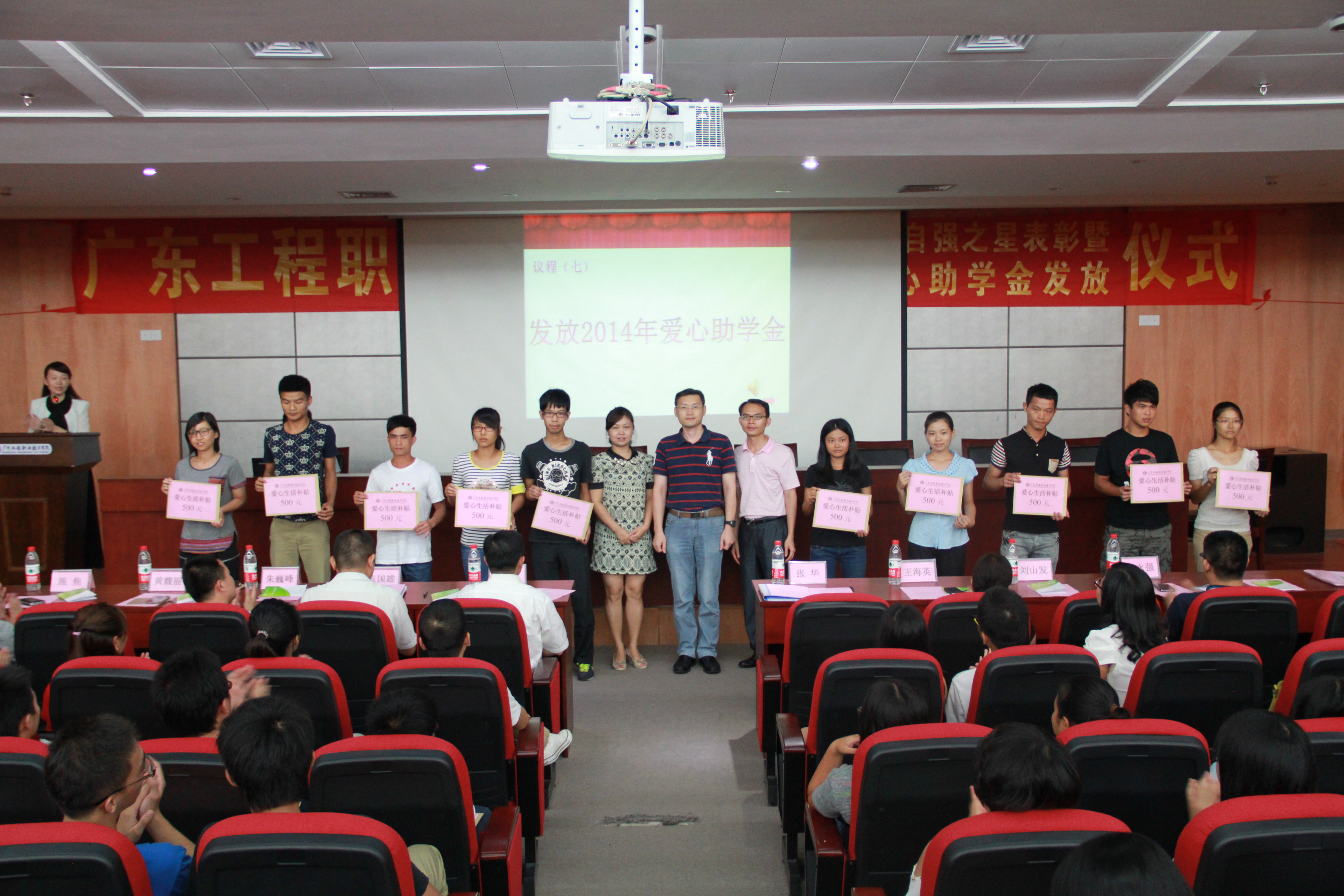 随后进行的是2014年爱心助学金发放仪式,受资助的机电工程学院学生代表方明坤同学发表了讲话,表达了国家、学校对贫困生的关爱之情,立下了奋发成才之志。学校李艇副校长、学生工作部部长张华为爱心助学金获得者发放助学金6000元。学生工作部部长张华、校团委书记黄馥丽和学生工作部副部长刘山发为获得爱心生活补贴的学生代表发放助学金500元。