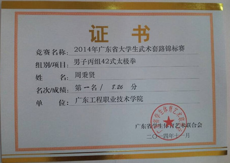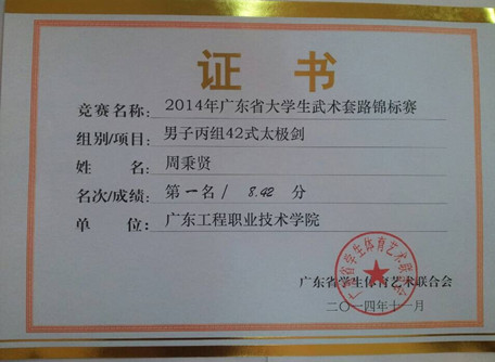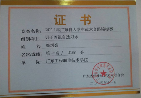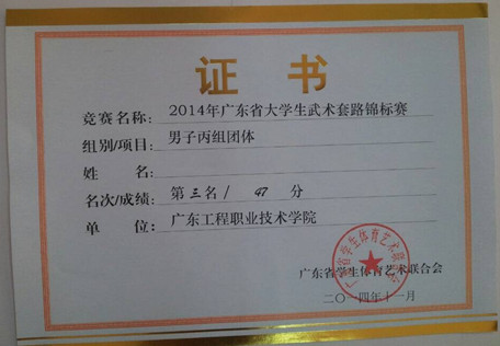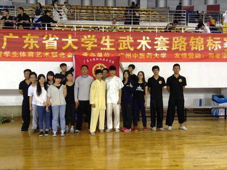11月21-23日我院武术队参加2014年广东省大学生武术锦标赛,通过组队集训和赛前动员,公共课教学部别业军主任担任领队,体育教研室方永文主任为教练带领我院武术队参赛,取得三个单项(男子丙组自选刀术、四十二式太极拳和四十二式太极剑)的冠军;两个单项(男子丙组自选长拳和自选南拳)的第三名;一个单项(男子丙组自选长拳)的第四名;一个单项(男子丙组自选南拳)的第六名。并获得团体总分第三名的好成绩。