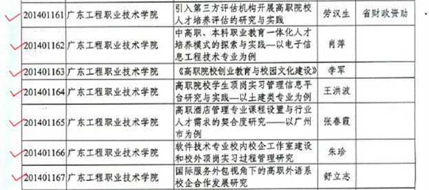 2014年度广东省高等职业教育教学改革项目评选结果揭晓,我校共有7个项目获得立项,立项数量获新高。其中,劳汉生校长申报的《引入第三方评估机构开展高职院校人才培养评估的研究与实践》项目获得10万元省财政专项资助。