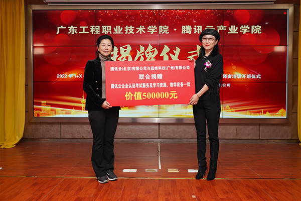 李丽校长、张莉总监共同为“腾讯云产业学院”揭牌后。张莉总监代表腾讯云(北京)有限责任公司给广东工程职业技术学院捐赠价值50万的物资,李丽校长代表学校接受了捐赠。
