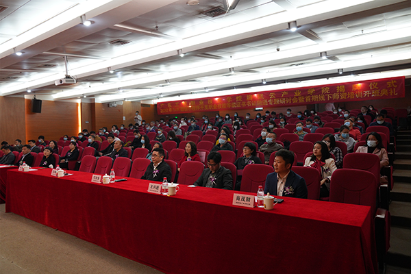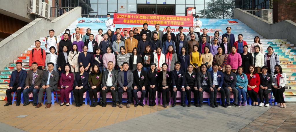 揭牌仪式结束,全体参会领导、嘉宾前往科技楼进行参观、交流,2022年1+X微信小程序开发职业技能等级证书书证融通专题研讨会暨首期线下师资培训开班典礼在科技楼601举行。培训时间为5天,通过考核可获得相关证书。