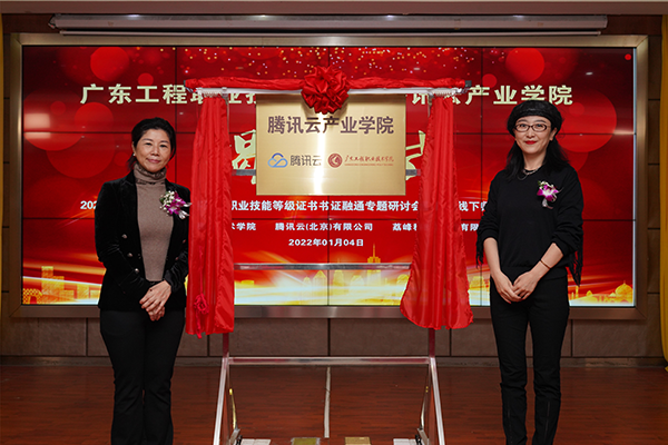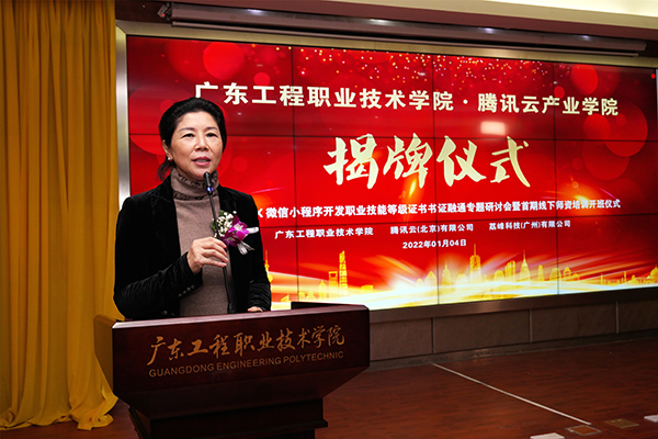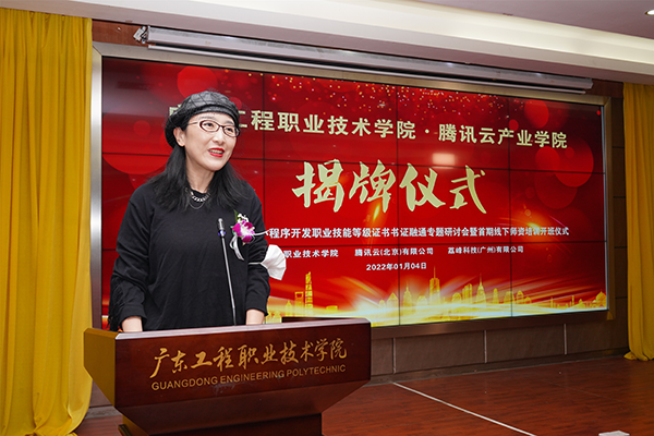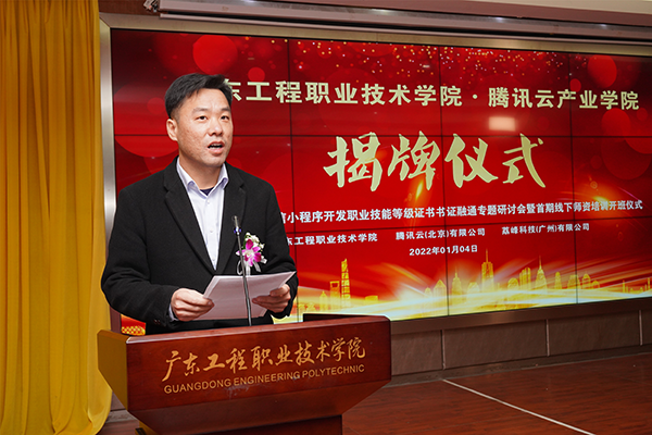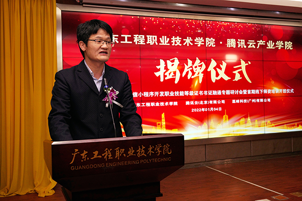 2022年1月4日上午,广东工程职业技术学院腾讯云产业学院揭牌仪式在我校图书馆报告厅举行。腾讯云计算有限责任公司校企合作中心运营总监张莉、高级运营经理李春梅、1+X证书运营经理熊军、统信软件技术有限公司区域总监王兴进、广州市漫游科技计算机有限公司总经理杨晓微、东软教育科技集团华南区总经理乐杰、广东时汇信息科技有限公司总经理唐海峰、荔峰科技(广州)有限公司总经理肖茂财、私立华联学院副校长崔英敏,我校校长李丽、副校长吴志敏、教务处处长陈淳慧、科技处处长邝治全、信息工程学院院长利业鞑、党总支书记桂爱民,以及各兄弟院校教师代表和信息工程学院师生代表参加了仪式。学校副校长吴志敏主持揭牌仪式。