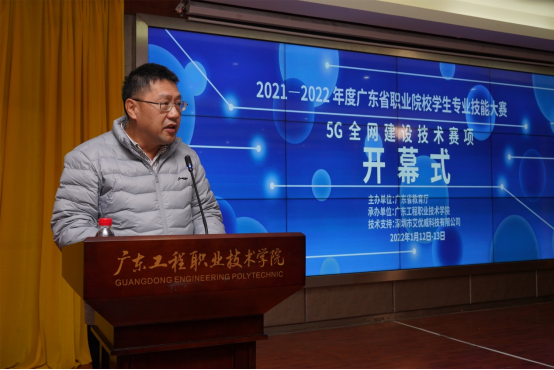 1月11日下午,开幕式在广东工程职业技术学院图书馆一楼报告厅举行。由学校吴志敏副校长主持,广东机电职业技术学院余蔚荔教授任大赛督察员,学校党委书记吴琦琳致辞。吴书记对大家的到来表示热烈欢迎,指出职业技能竞赛为广大技能人才提供了展示精湛技能、相互切磋技艺的平台,同时也能充分展示学校的教育教学成果,达到“以赛促学、以赛促教”的目的。我校承办广东省职业院校学生专业技能大赛5G全网建设技术赛项将以饱满的热情、高度的责任感,做好每一项工作,齐心协力把赛事办好。