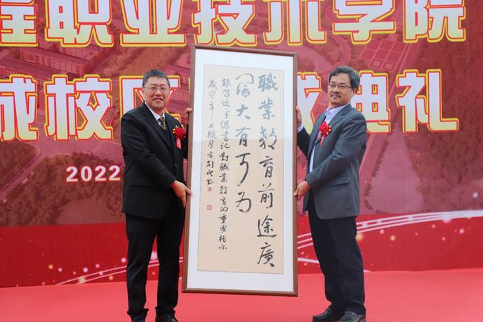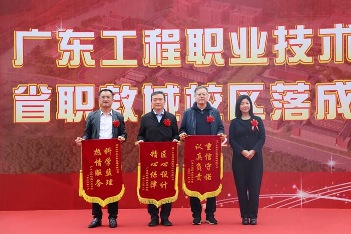 典礼上,广东省基础工程集团有限公司向学校赠送了书法作品,学校党委书记吴琦琳、李丽校长先后代表学校向有关单位代表赠送了建设纪念牌和锦旗。