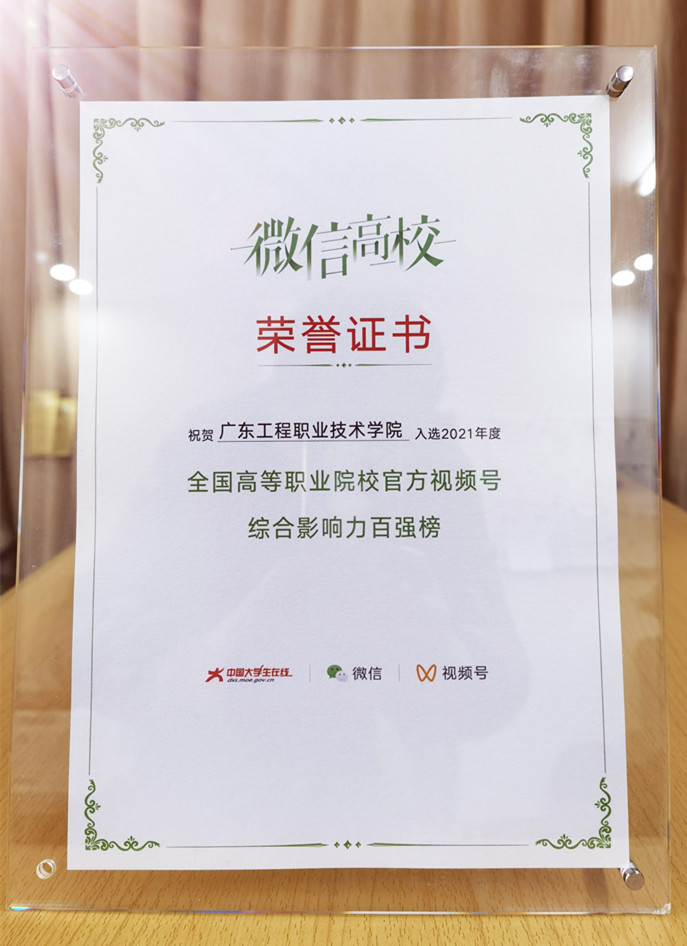2月15日,教育部中国大学生在线联合微信官方通过快递颁发了“全国高等职业院校2021年度官方视频号综合影响力百强榜”荣誉证书,组织宣传统战部运营的学校官方视频号荣获“综合影响力百强榜”,学校网络影响力再度攀升。