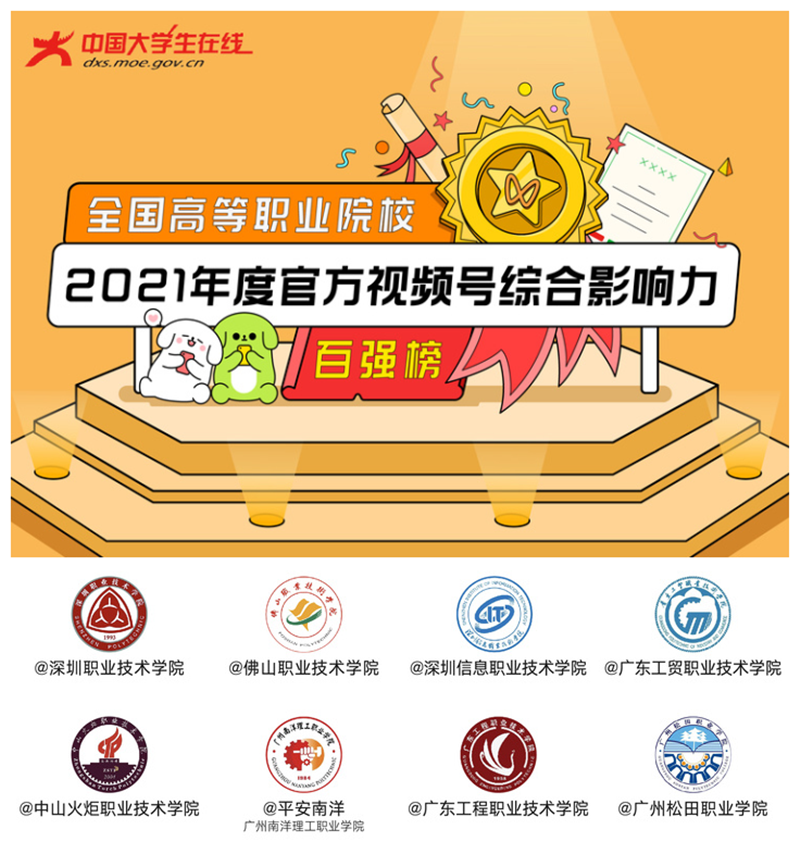 中国大学生在线是教育部主导并推动,全国大学生参与,全国高校合作共建的网络文化建设与主题教育平台,集中展示高校风采,发布主题活动,聚合教育信息。该平台推出“全国高等职业院校2021年度官方视频号综合影响力百强榜”,榜单根据各高校视频号活跃度、传播力、互动值,以及重点网络文化活动参与度、示范带动作用等维度综合评价,旨在引导和鼓励高校新媒体平台积极传播网络正能量,服务青年学生成长成才。(组织宣传统战部 张习涛供稿 刘松梅审核)