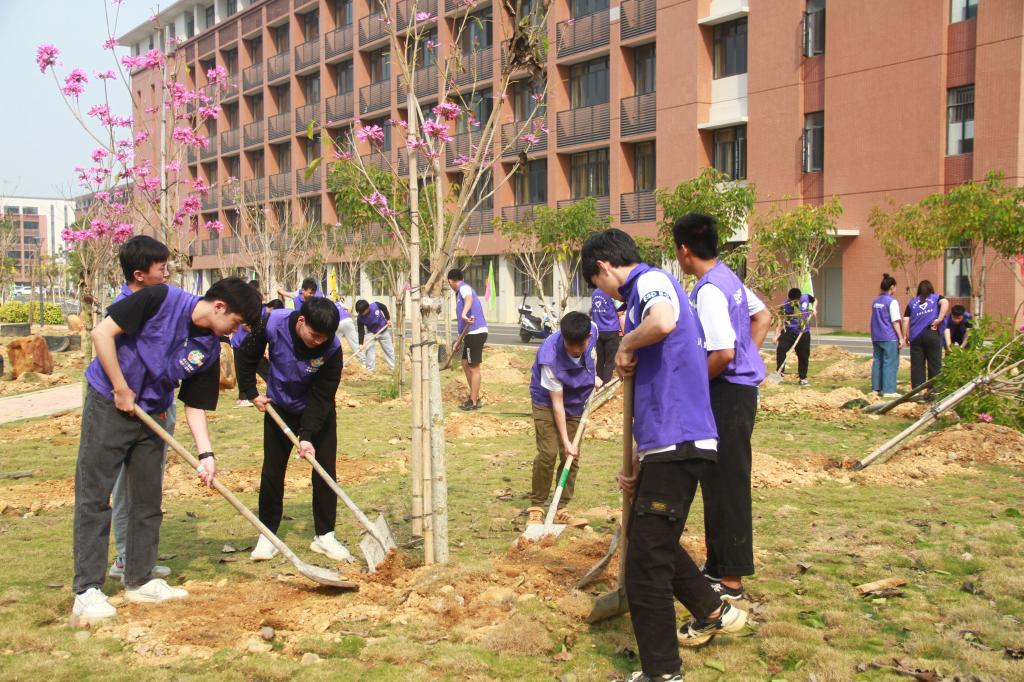 在大家的共同努力下,一棵棵风铃木、凤凰木在我校多片“荒地”上昂然挺立。此次活动省职教城校区共栽种树木近900株,植树面积达50亩,品种包括风铃木、凤凰木及金丝楠木等。