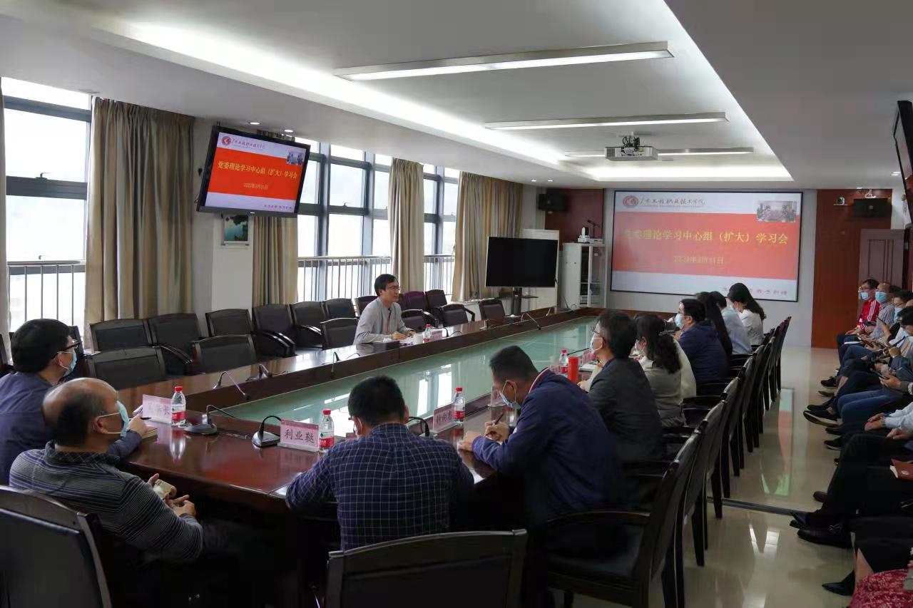 3 月 31 日下午,学校党委理论学习中心组(扩大)举行专题学习会,深入学习贯彻习近平新时代中国特色社会主义思想,深刻领会“两个确立”的决定性意义,深入贯彻落实习近平总书记关于疫情防控的重要指示精神,从严从紧从细做好校园当前疫情防控工作。学校党委书记吴琦琳主持会议。党委委员、副校长张小广作领学发言,学生工作部部长黄馥丽、信息工程学院党总支书记桂爱民、公共服务学院党总支书记吴文丰作了学习交流发言。学校全体校领导,全体中层干部参加了会议。