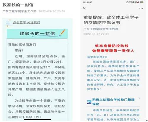 在这场没有硝烟的战役中,学校领导、各职能部门和二级学院工作人员、辅导员、班主任、安保人员、志愿者、义警队等全体师生坚定站在疫情防控第一线,认真做好校门口值班、核酸检测、实习管理、常规教学+线上教学、宣传引导等工作。
