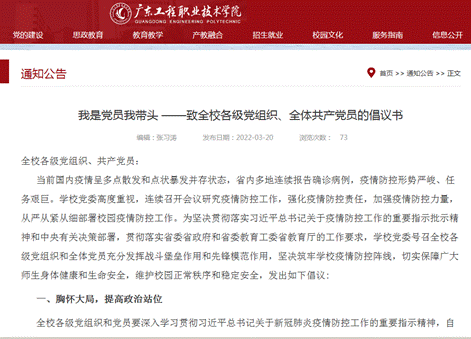 “同学请出示行程码与健康码,测量体温。”“认真遵守学校防疫要求,我们每个人都是自己健康的第一责任人。”党员师生主动请缨,挺身而出,闻令而动、冲锋在前,积极主动参加值班值守、协助核酸检测、防控排查等工作,在守护师生生命健康安全中践行初心使命。后勤安保部门严格落实校门进出管理,定期对学生宿舍、教室、实验室、运动场所等区域开展卫生清扫及消毒,筑起一道道“红色防火墙”。学生工作部门召开疫情防控学生工作紧急会议、召开清明节前疫情防控学生工作会议,加强学生管理,认真落实“日报告”“零报告”制度,确保每个学生都要有人管、有人联系,做到“三个清楚”。教学部门召开“岗位实习和疫情防控教学工作专题会议”,研究和部署疫情期间保证教学进度、教学质量、实习工作,切实保障疫情期间正常教学秩序。“大家注意戴好口罩,保持间距。”“勤洗手,保持通风,宿舍是我们共同的家”。校团委组织学生志愿者深度参与防疫志愿服务,开展协助严把校门关和协助核酸检测、秩序维护、卫生清洁等志愿活动。马克思主义学院制作了《高校常见涉疫违法违纪专题教育》课件,开展防疫普法宣讲200多场次,覆盖了全校学生。建筑工程学院、管理工程学院召开疫情防控主题学生座谈会,围绕校园文化建设、疫情防控管理等方面建言献策。机电工程学院、人文艺术学院、公共服务学院结合师德师风学习教育,引导教职工认真严格落实好校园疫情防控工作要求,切实维护校园秩序和安全。信息工程学院、人工智能学院落实实习学生疫情防控要求,加强与实习学生的联系与跟踪,健全完善学生健康管理信息数据。财经学院组织师生党员、入党积极分子走访学生宿舍,宣传校园防疫要求,关心同学们的生活、学习情况。全校师生并肩作战,同心抗疫,废寝忘食、不分昼夜,严格执行各项防疫制度,积极参加疫情防控各项工作,以积极乐观的心态共同守护校园。