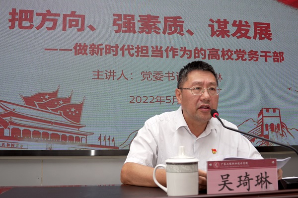授课中,吴琦琳以《把方向、强素质、谋发展——做新时代担当作为的高校党务干部》为题,深入聚焦习近平总书记重要指示批示和讲话精神,结合“十四五”时期承担的重点任务目标、面临的发展形势和风险挑战,分别从“把准方向,明确新时代高校党建工作的新要求”、“提升能力,成为高素质业务化的学校党务干部”、“善抓工作,以高质量党建引领学校事业高质量发展”三个方面,全面、系统地进行了深入阐述。