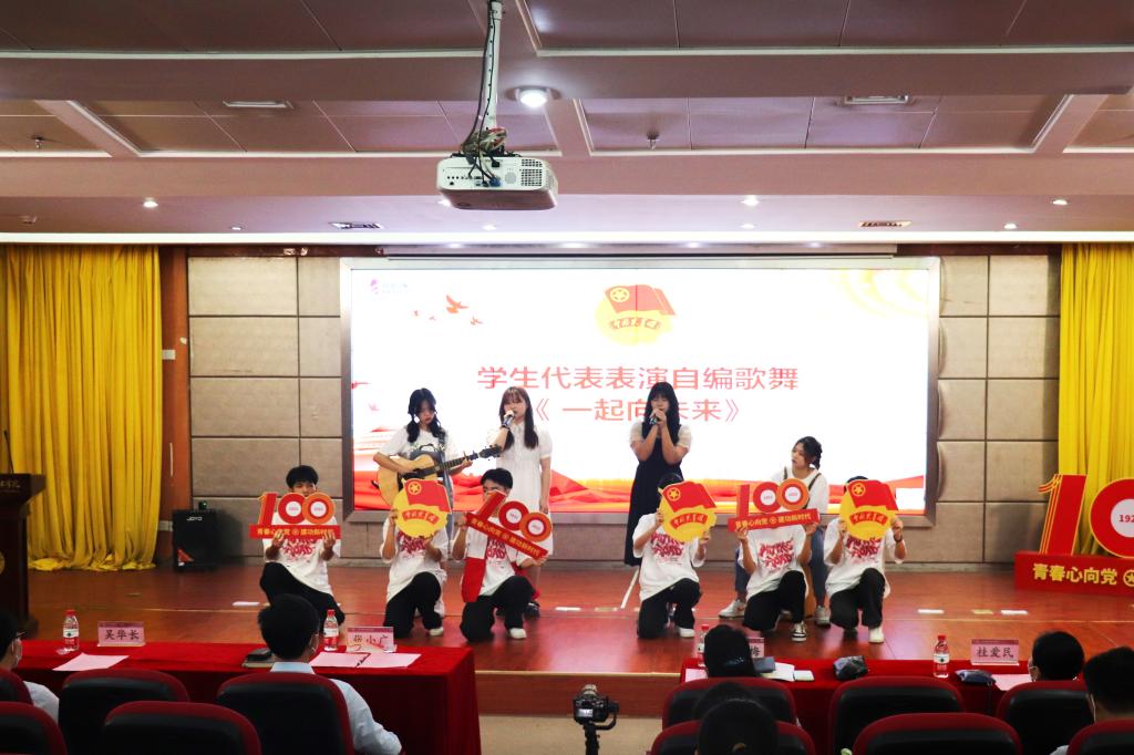 伴随着激昂的国歌,大会正式拉开序幕。与会人员一起观看团中央庆祝建团百年视频《共青春》,见证一百年共同的青春;随后青马学员和校广播台代表带来了激情飞扬的诗朗诵《五四火炬》《我是一艘船》;紧接着青年学子们以抗疫“手势舞”这种特别的方式,并配合青春飞扬的歌舞《一起向未来》为这场“战疫”注入温暖;学生代表还献唱了学校献礼建团百年原创歌曲《新时代青年说》,并以歌曲《万疆》诉说一腔爱国情怀。