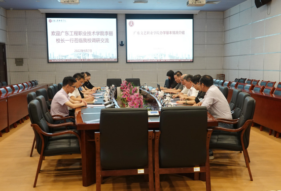 6月7日下午,校长李丽带队赴广东文艺职业学院交流学习,广东文艺职业学院校长钟善金热情接待我校一行。我校党委副书记、纪委书记徐振昌及相关职能部门负责同志,广东文艺职业学院党委副书记邱广林、党委委员、纪委书记叶兵及相关职能部门负责人参加了交流活动。