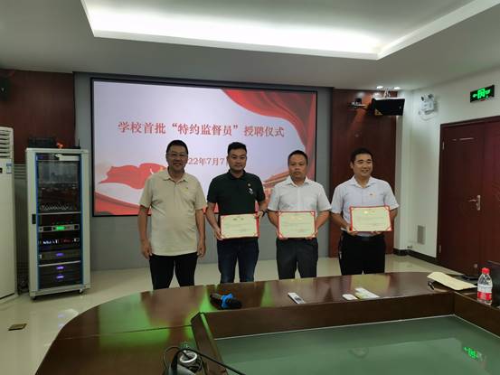 吴琦琳为马克思主义学院教师曾名沁、人工智能学院教师卢世军、财经学院辅导员林密蒲颁发了“特约监督员”聘任证书。他强调“特约监督员”在今后的监督工作中要认真围绕监督、参谋咨询、桥梁纽带等职责开展工作,共同推动我校纪检工作再上新台阶,促进学校高质量发展。