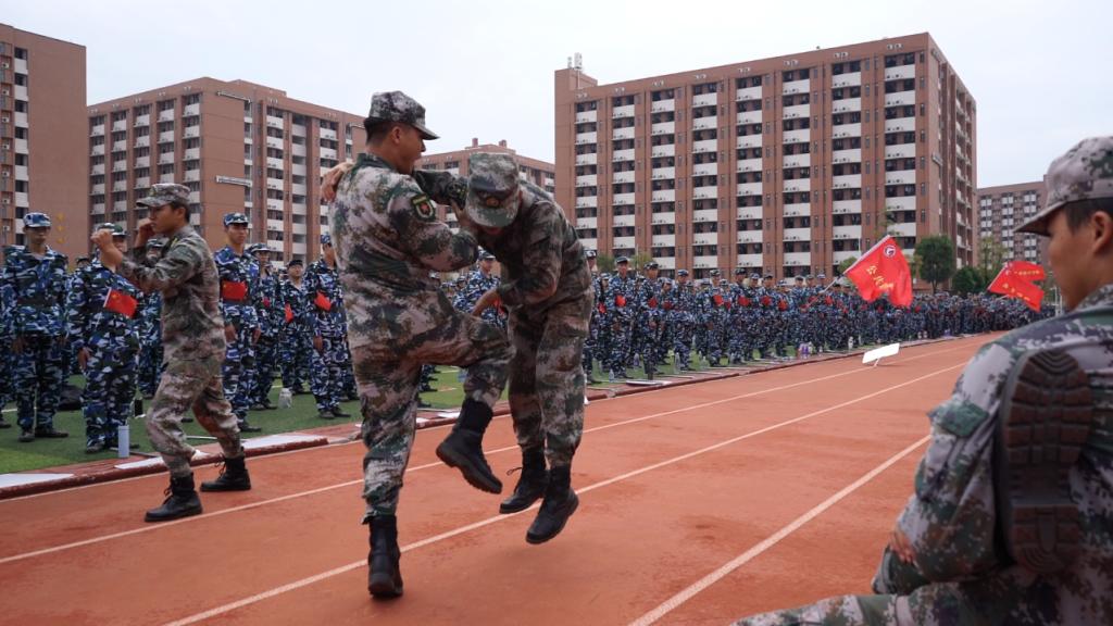 随后,承训部队教官进行军训科目示范动作表演。他们坚定有力、整齐划一的步伐,一招制敌、一拳制胜的动作,充分展现出严明的作风与飒爽英姿的精神面貌,让同学们大开眼界,赞叹不已。