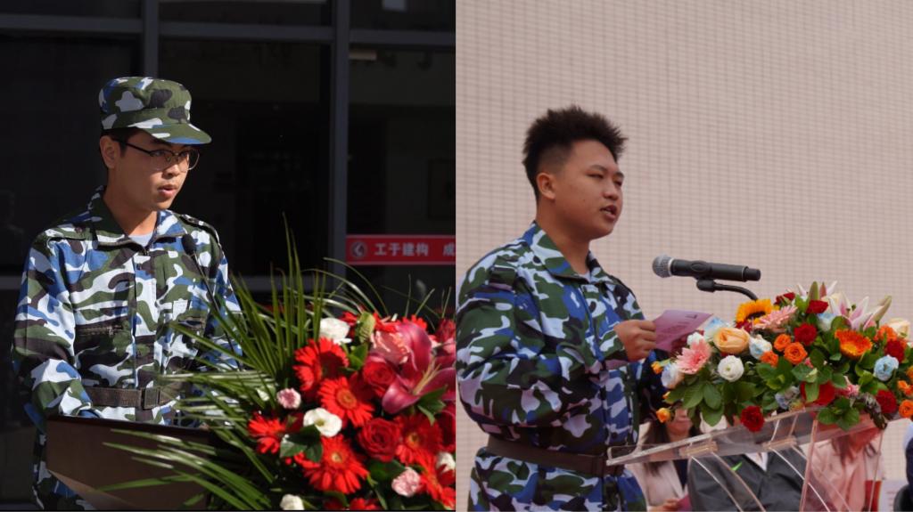 承训部队教官张少锋、李荣根代表教官发言。他们承诺严格要求,按纲施训,确保高质量完成军训任务。希望参训学生服从命令,听从指挥,团结同学,严守纪律,吃苦耐劳,勤学苦练,铸就青春向党的赤子之心,展现令行禁止的军人气魄,养成使命必达的军人作风。