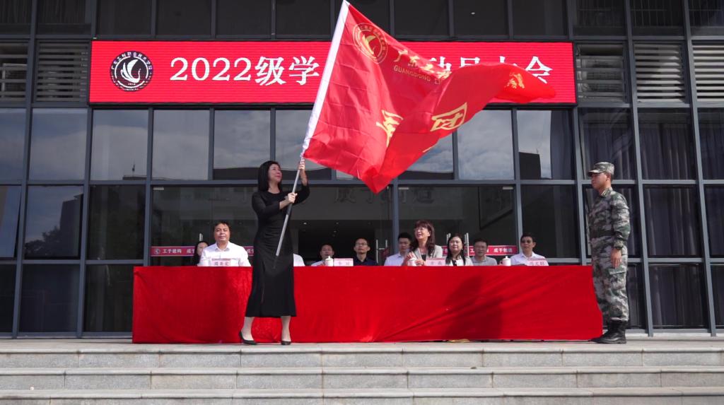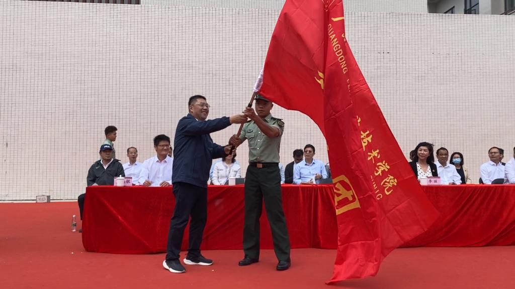 党委书记吴琦琳、校长李丽向军训团教官代表冯伟东、冯文聪授军训团团旗。授予旗帜是赋予使命,接过旗帜是扛起责任。