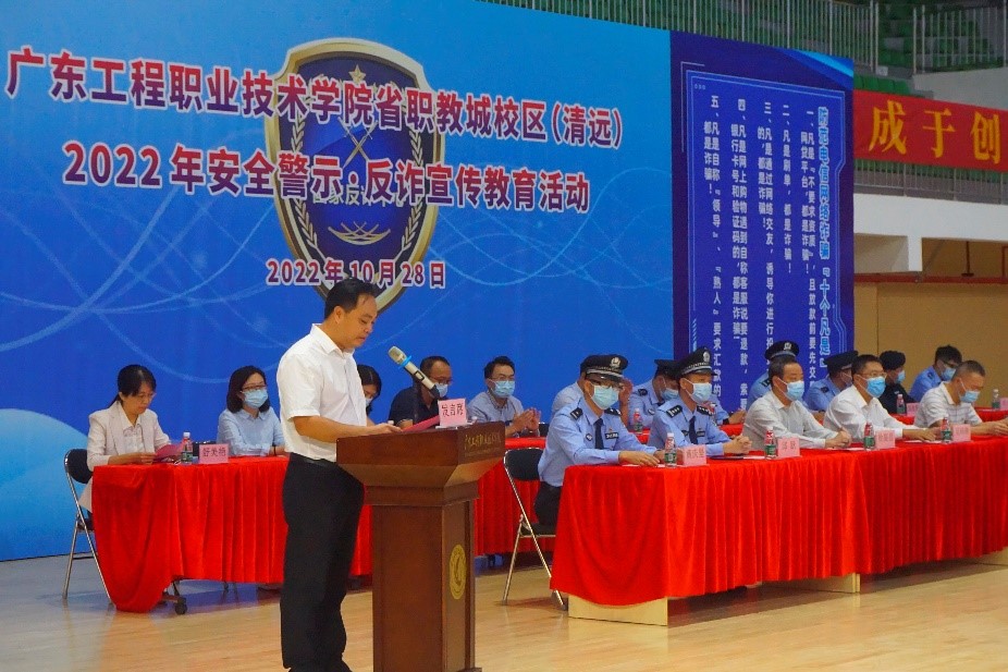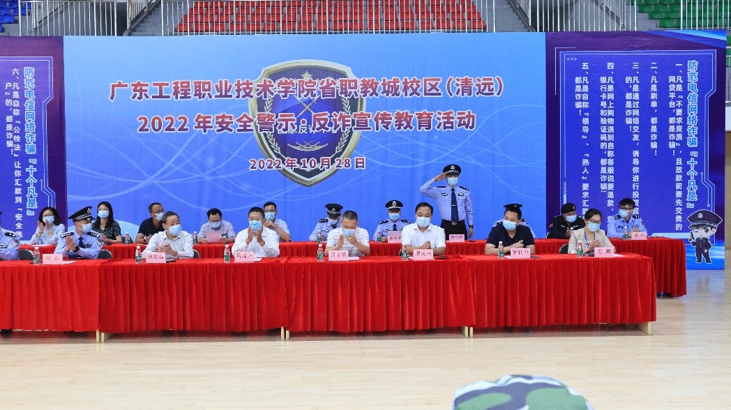 清远市社会治理协调办第四督导组二级高级警长黄良斌、清城公安分局党委委员、副局长邱跃及清远市反诈办、职教城反诈中心、省职教城派出所、东城街道办等单位领导莅临指导。学校党委书记吴琦琳、学校党委副书记、纪委书记徐振昌、学校党委委员、副校长揭英荣出席活动,参加活动的还有学生工作部、总务后勤部(保卫部)、团委,校区二级学院副书记、新生辅导员。活动由总务后勤部(保卫部)部长舒美艳主持。